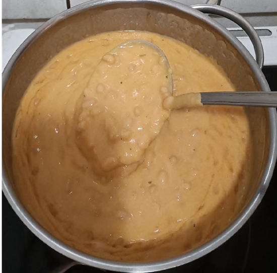 - Amikor a bab kezd megpuhulni, a tejfölt és a lisztet csomómentesen összekeverjük.