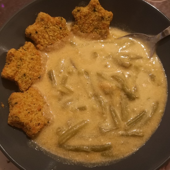 - Ezután hozzáadjuk a tej felét és az üveges zöldbabot (levével együtt). S az egészet alaposan átkeverjük.